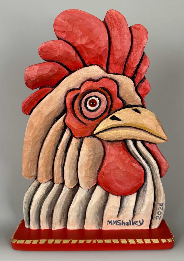 carved white pine, acrylic paint, gold leaf, glass decoy eye