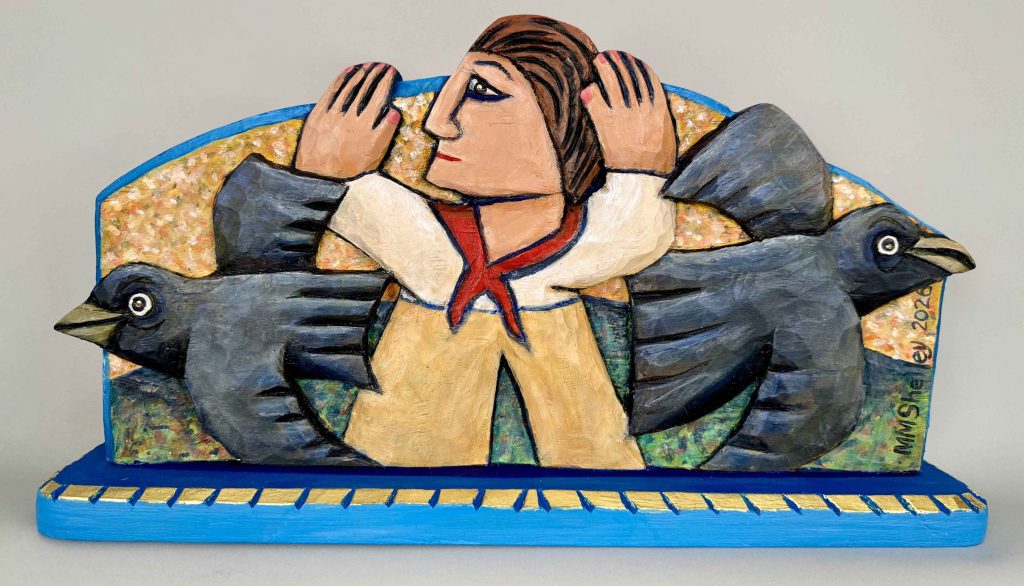 Carved white pine, acrylic paint, gold leaf, brass tacks